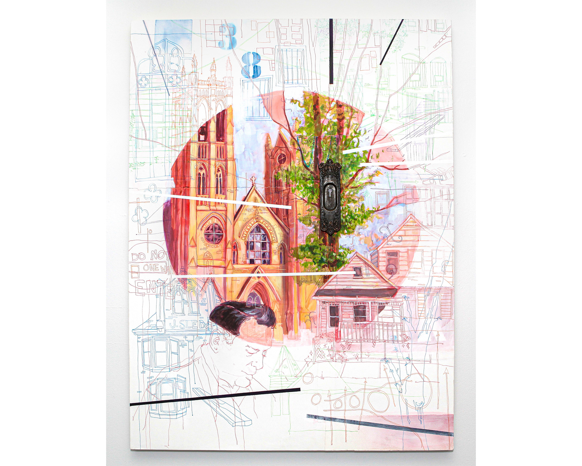 Acrylic, ink, spray paint, found object on paper on panel.
