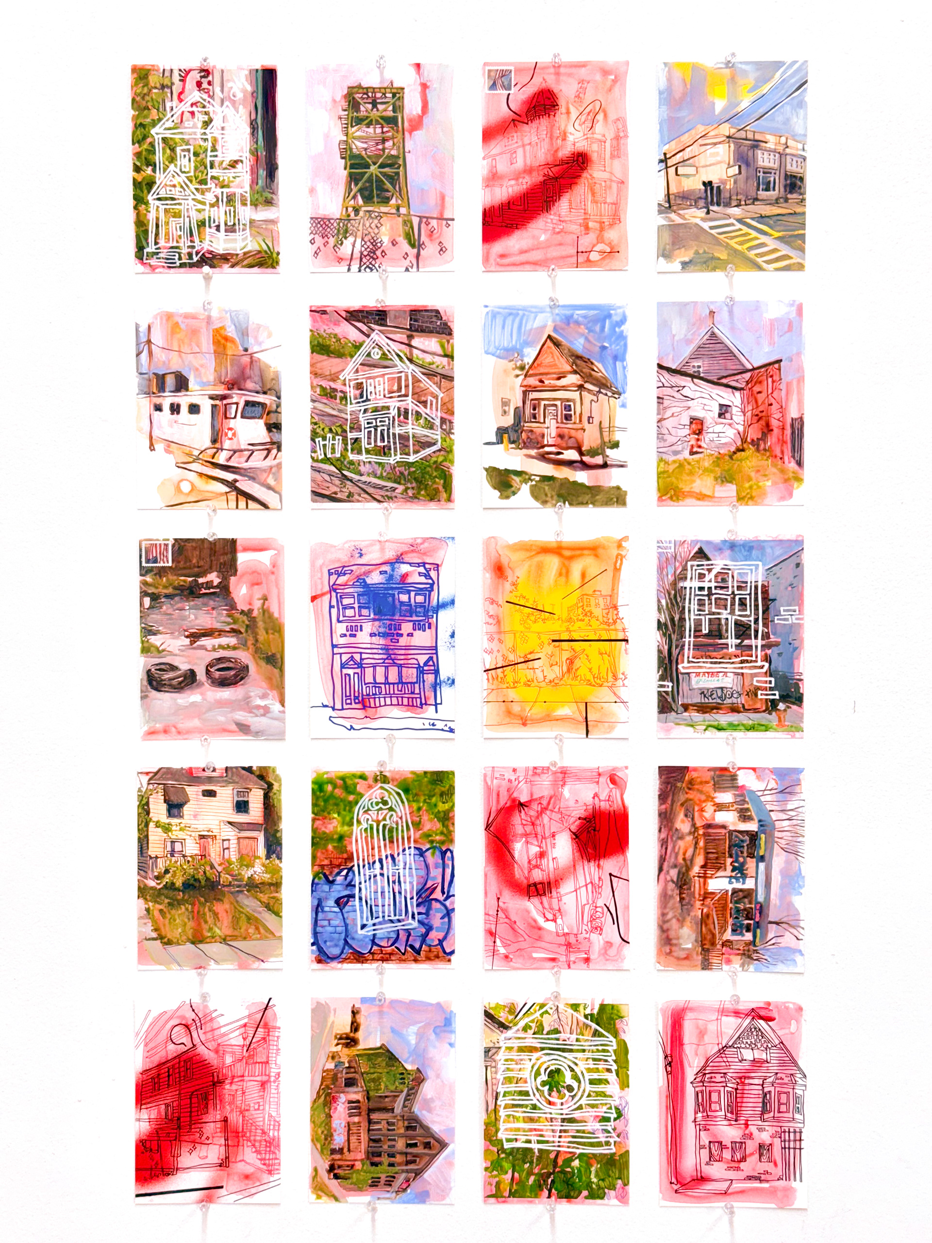Acrylic, ink, spray paint on 5x7" yupo postcards.
