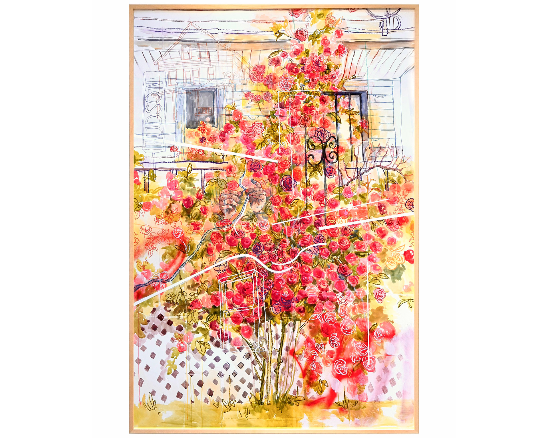 Acrylic, ink, oil pastel, colored pencil, paper on panel.